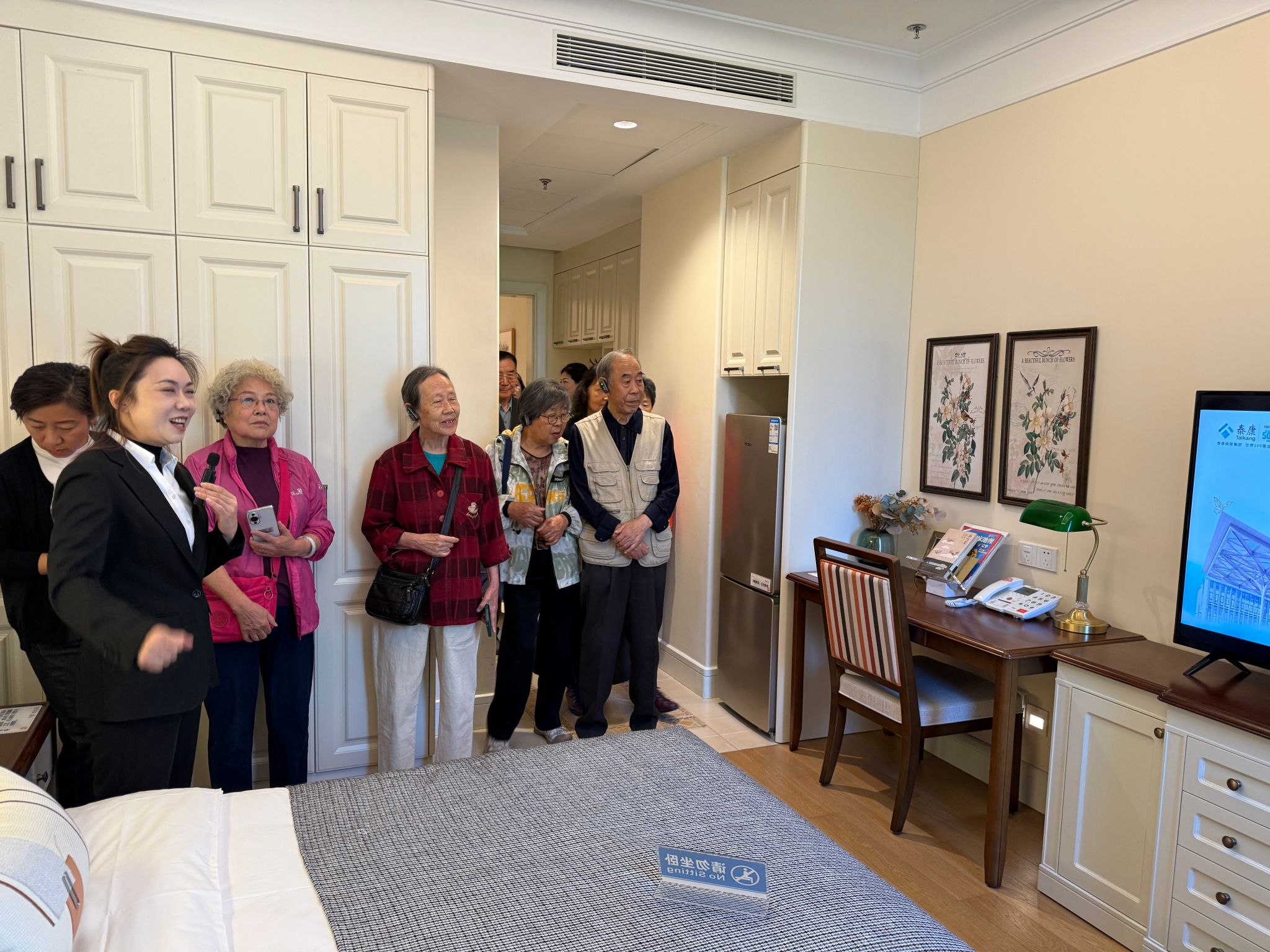 考察过程中,老同志们首先走进养老社区的居住区域,重点参观了一室、两室等4种不同户型的生活公寓。泰康之家・沈园的工作人员从房间的空间布局、适老化功能设计、日常运维服务及各类户型费用等细节进行了详尽讲解。随后,老同志们对文娱中心、文体中心、老年大学、社交中心、多功能厅等场所以及园区环境和设施进行了实地考察。大家一边参观书画室、健身房、游泳馆、阅览室等功能空间,一边聆听工作人员介绍社区定期开展的兴趣课程、文体活动与社交联谊项目,亲身感受社区在满足老年人精神文化需求、保障生活便利与健康安全方面的用心设计。